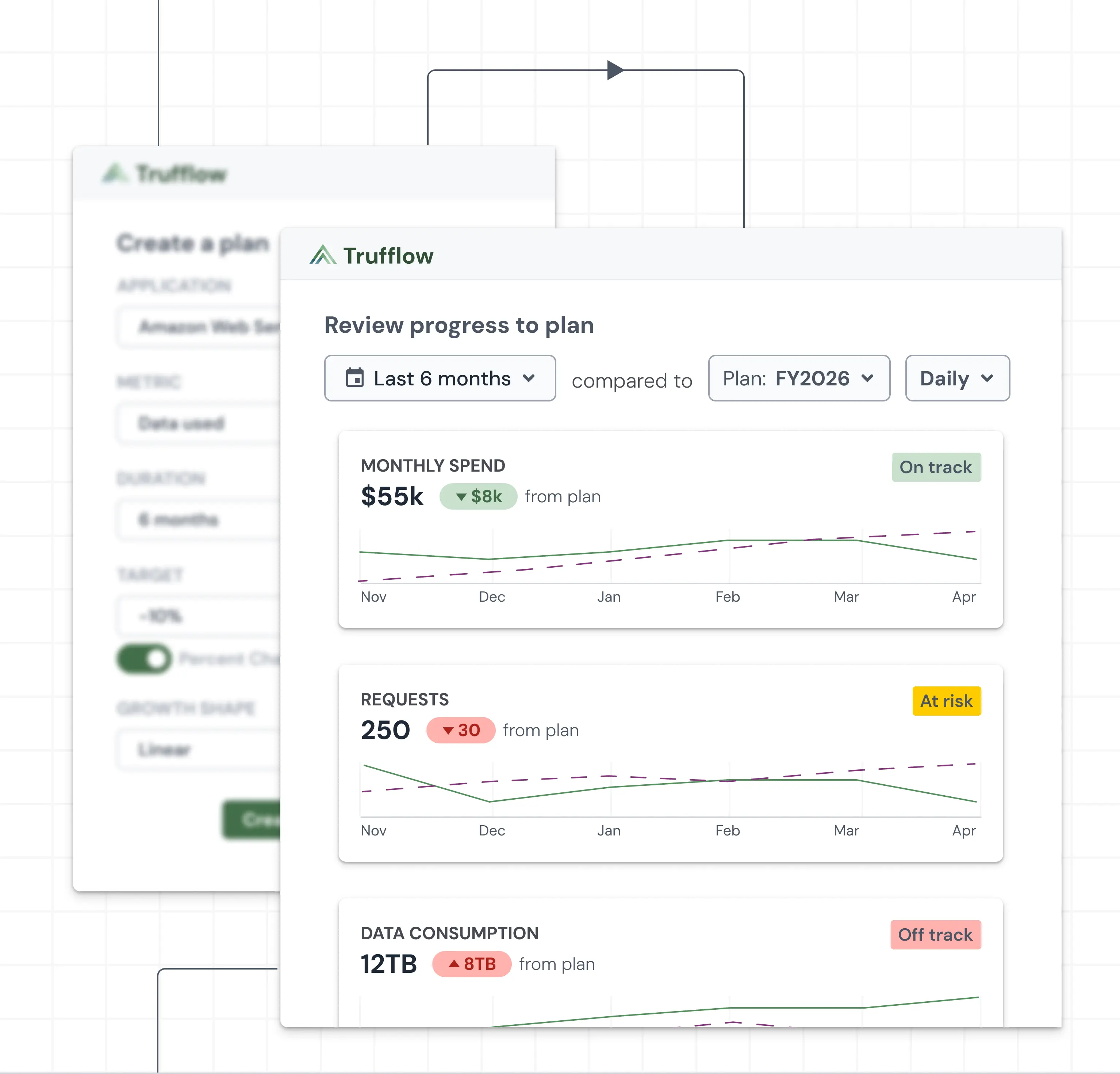 Monitor your progress with ground-truth data, automatically collected and aggregated by the Trufflow platform. Get alerts when your plans fall off track. Use in-app scenario planning and forecasting to get yourself back on track.