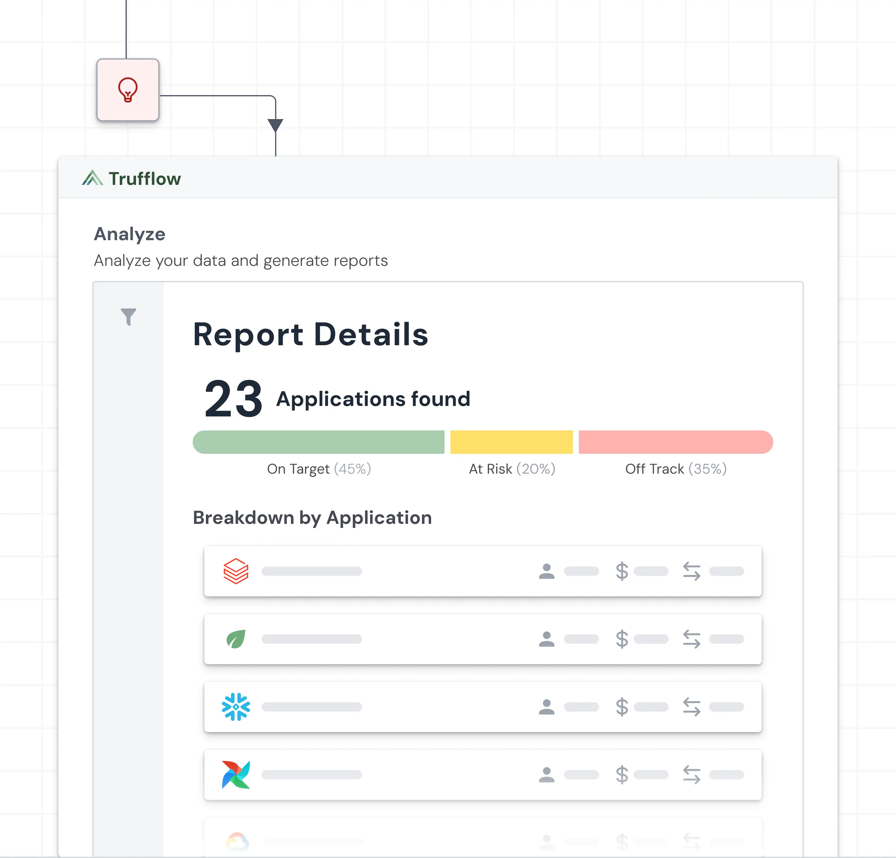 Connect your application stack to Trufflow through our SDKs, our Open API conformant APIs, or through integrations to your existing telemetry and FinOps tools, including: Apptio, DataDog, Dynatrace, Grafana, or Splunk.